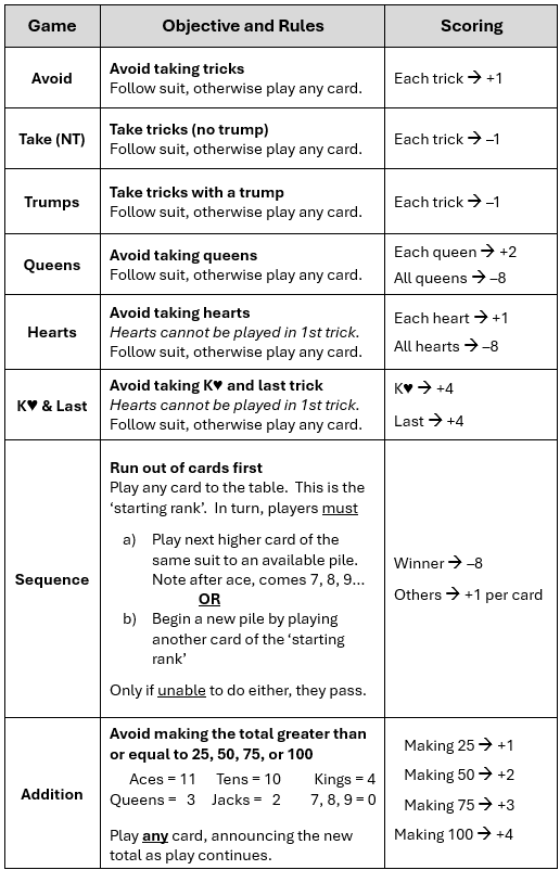 When it is your turn, you announce one of the games from the list below and then play the first card to begin the hand. Each player has an equal number of turns.